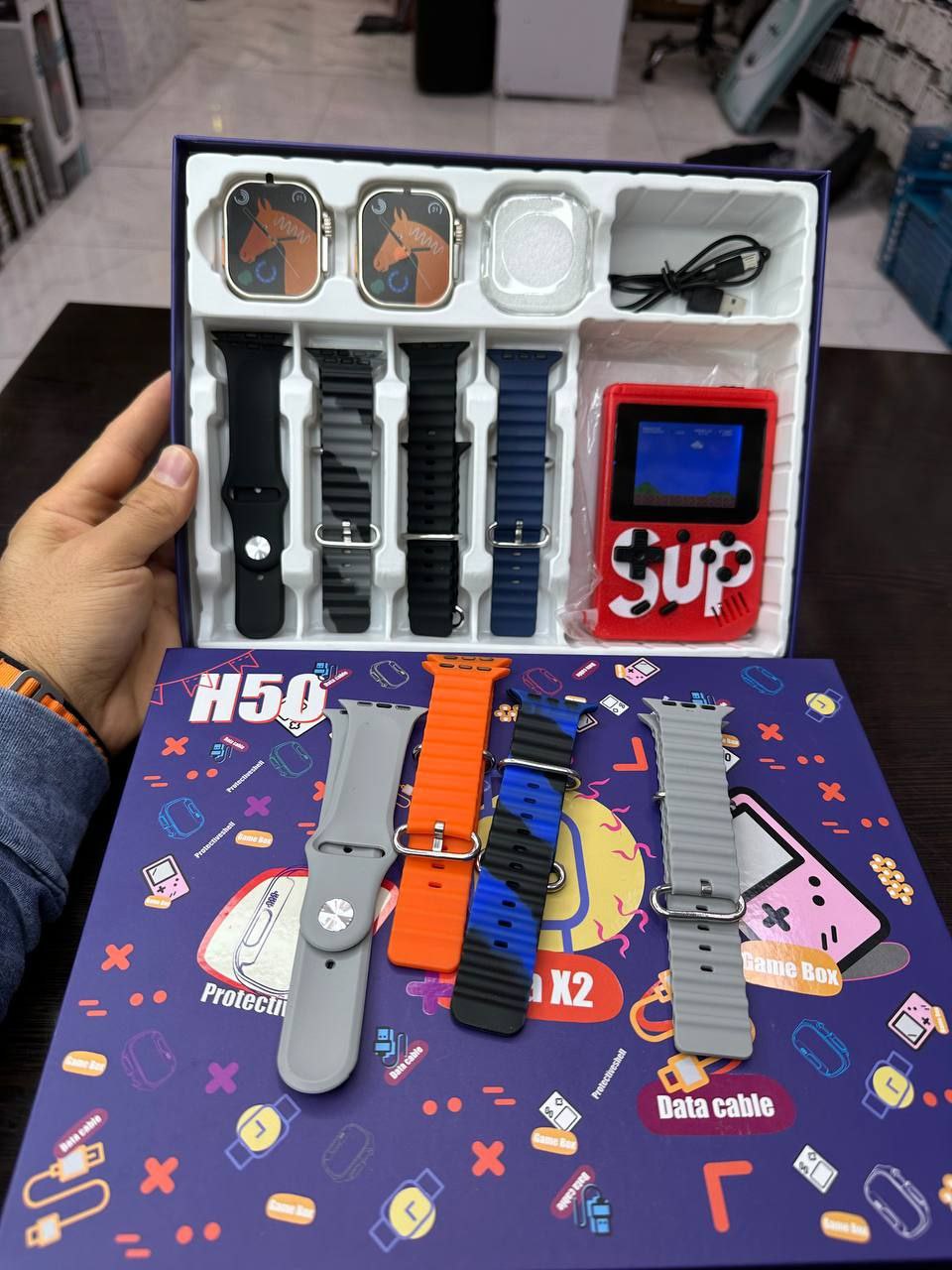 پک ساعت هوشمند H50 یک پیشنهاد جذاب برای دوستداران ساعت هوشمند و بازی است. این پک شامل دو ساعت هوشمند الترا با طراحی زیبا ، 8 بند مختلف و امکانات متنوع و یک کنسول بازی SUP با 400 بازی نوستالژی است.